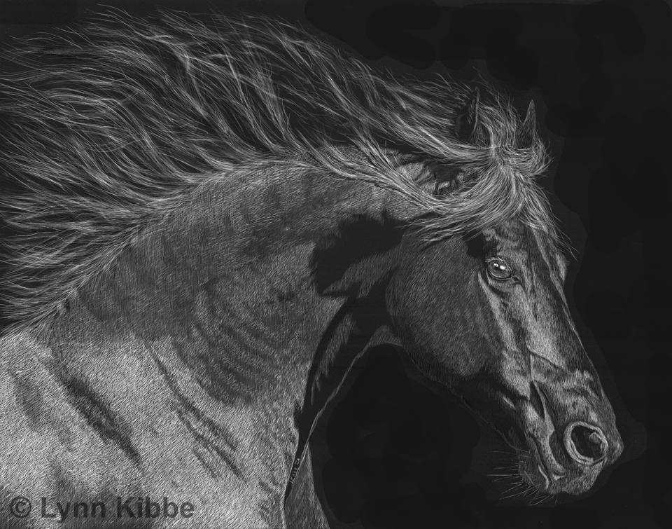 I am a professional artist specializing in nature and animal art. After having worked in other art media, I now work exclusively in fine art scratchboard. My scratchboard drawings are representational, many times without flamboyance and flair to present peacefulness. I observe and interpret what I see in my own way through my work. Scratchboard is a very tedious medium which takes many weeks to complete just one. I create it by removing the black ink layer (revealing the clay below) by scratching a layer off, then repeating it again and again to build depth and values. Everything in the image is made of a scratch of some kind. If in color, I paint those colors in after the black is removed, then the process begins again with layers of scratching that are interwoven with layers of coloring to build up depth and values.